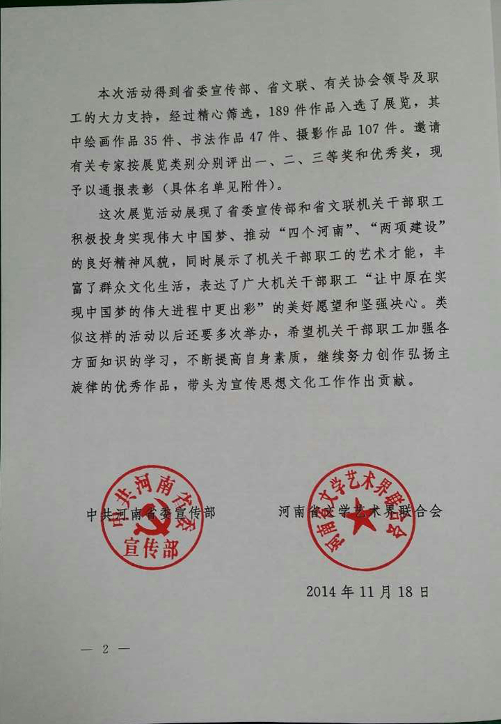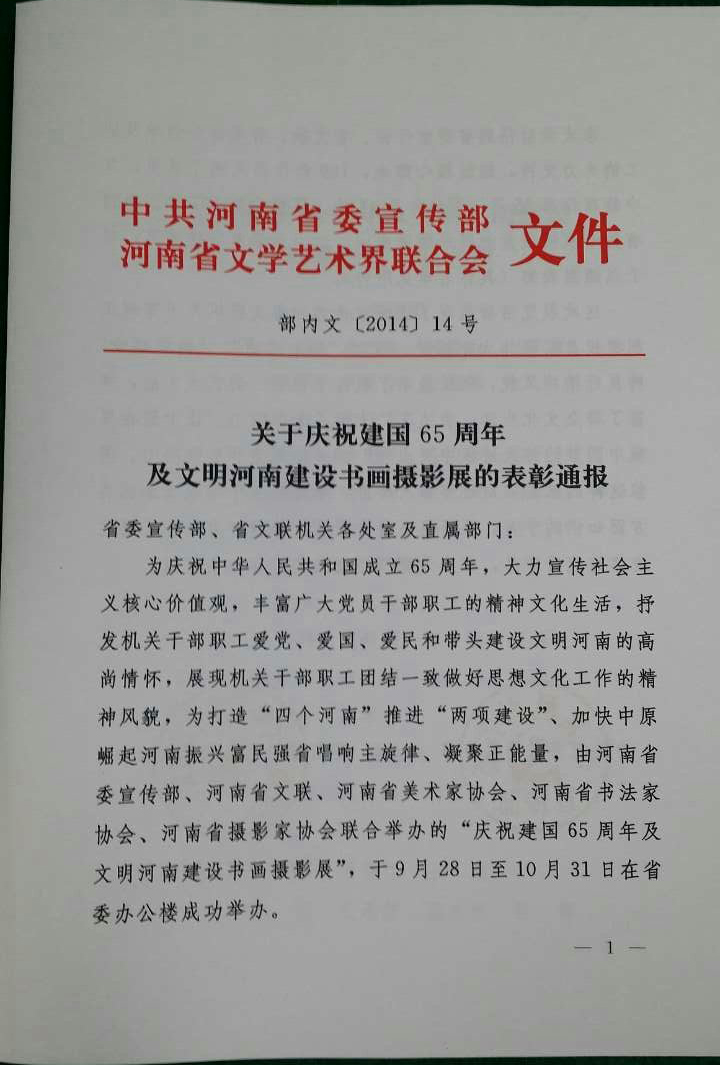 關(guān)于慶祝建國(guó)65周年 及文明河南建設(shè)書畫攝影展的表彰通報(bào)